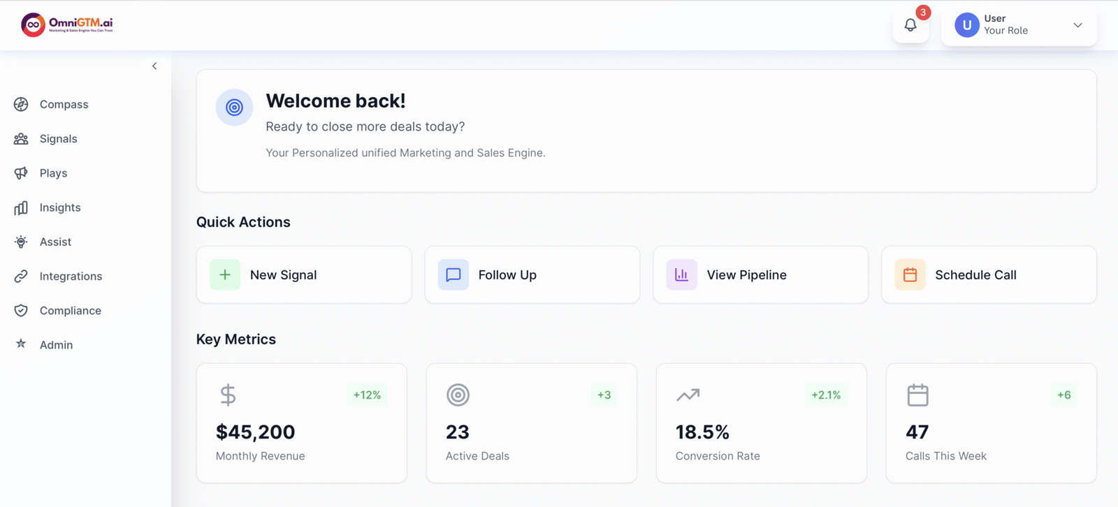 Start with Compass, add Signals, Plays, Insights, or Assist as you grow. Each module works on its own but connects seamlessly when combined.