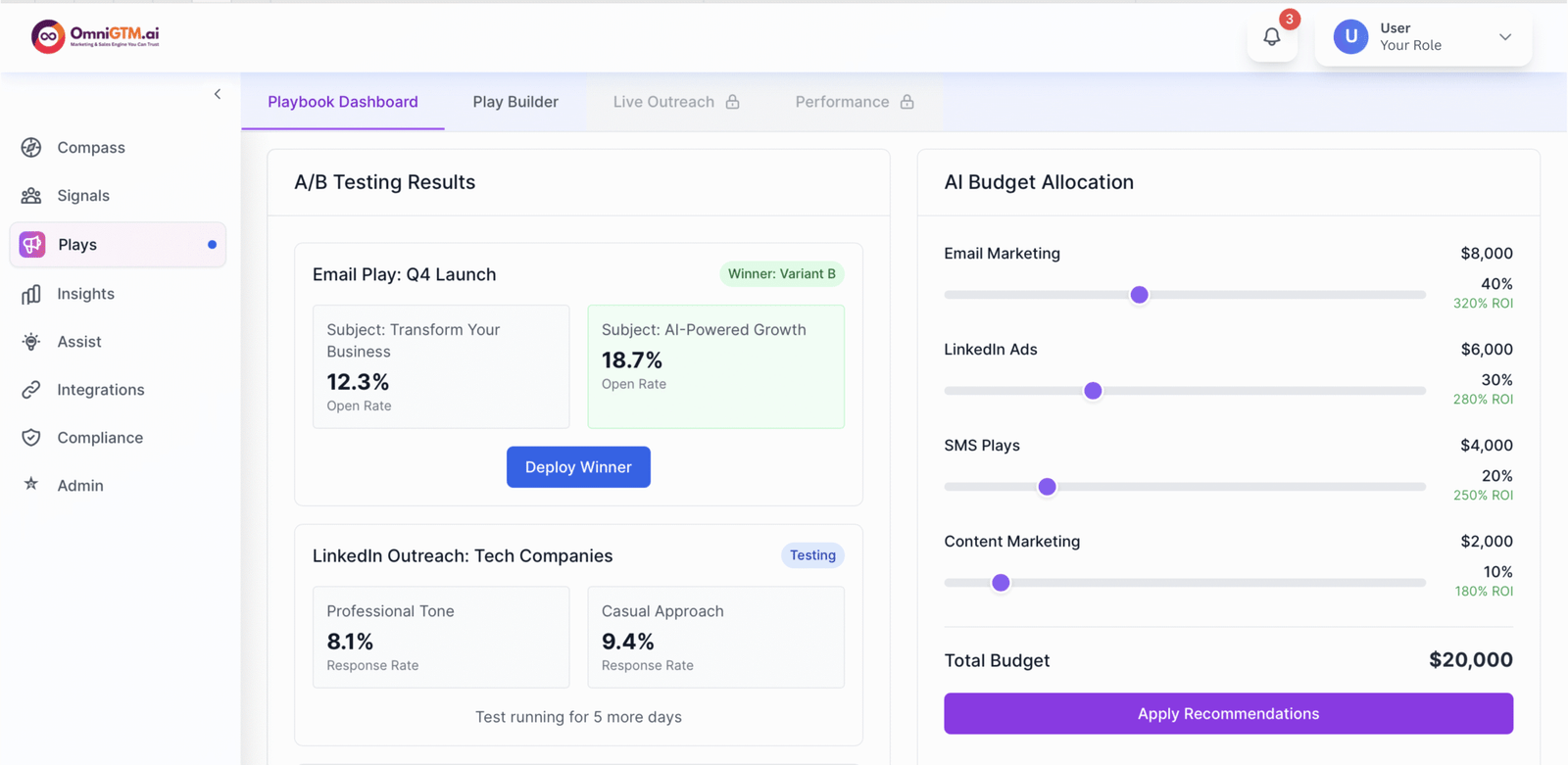 Plays turns prioritized leads into multichannel campaigns with AI-guided sequencing and adaptive messaging. Performance loops back into Compass and Signals, sharpening execution continuously.