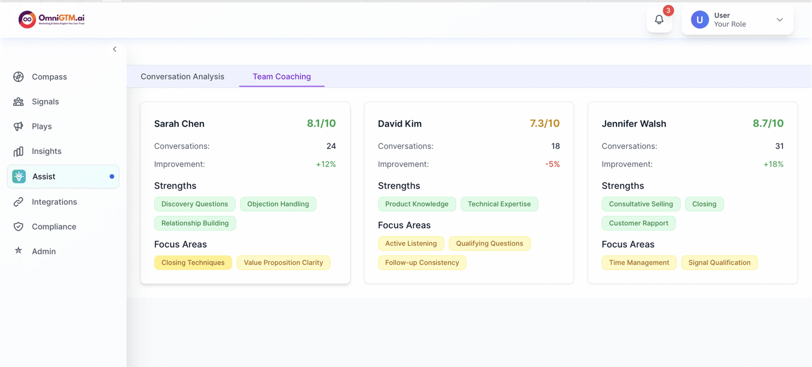 Empower every interaction with Assist, the AI copilot that supports your frontline teams. Drawing from Plays' orchestrations and live customer data, Assist surfaces real-time recommendations from conversation prompts to objection handling to next-best actions. By combining context from Compass, Signals, and Plays, Assist ensures reps engage with precision and confidence. Every engagement captured by Assist feeds back into the analytics layer, enriching Compass for smarter long-term strategy.