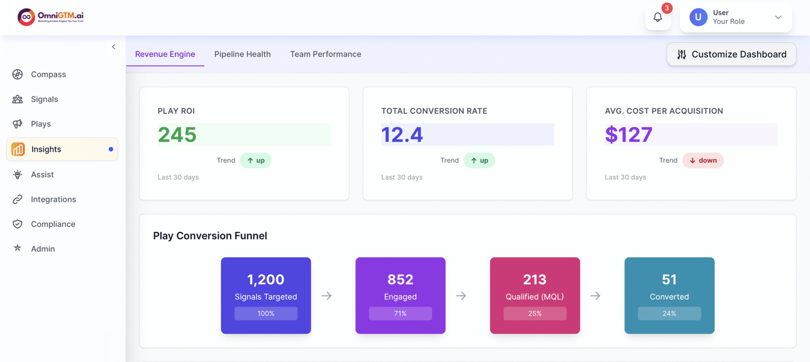 Close the loop with Insights, the analytics hub that validates outcomes across the entire OmniGTM.ai ecosystem. Insights consolidates data from Compass, Signals, Plays, and Assist to deliver performance dashboards, ROI tracking, and predictive forecasting. By measuring impact and surfacing new trends, Insights confirms what's working, flags what's not, and feeds fresh intelligence back into Compass. The result is a self-optimizing GTM engine that learns, adapts, and compounds value over time.